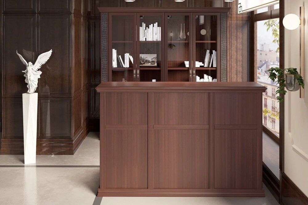 Кабинет руководителя Doge - итальянская классика, сочетающая в себе функциональность и безупречный стиль. Теплая текстура натурального дерева создадут атмосферу уюта и стабильности в вашем кабинете, а глубокий цвет Ореха Танганьика и рельефная резьба подчеркнут вашу индивидуальность.